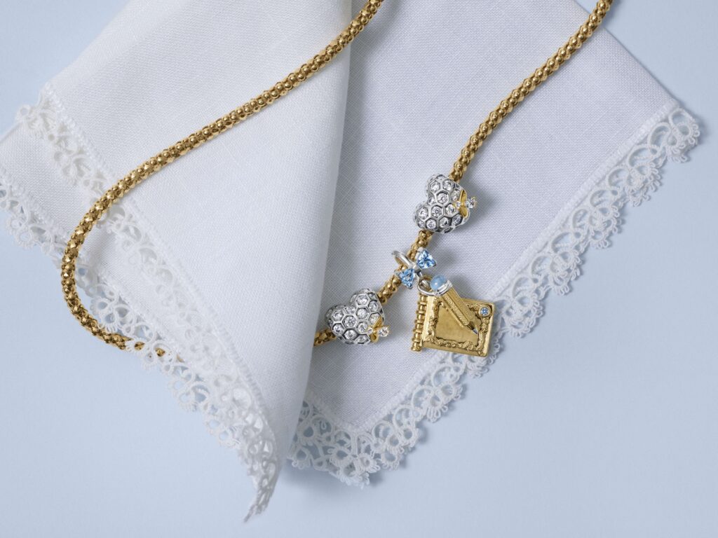 ‘We bekijken de Regency-stijl door een hedendaagse lens,’ aldus Pandora’s Creative Directors Francesco Terzo en Filippo Ficarelli. ‘We lieten ons inspireren door de bij – voor altijd verbonden met de familie Bridgerton. Deze collectie gaat over bloeien, waarbij de bij en de bloem verwijzingen zijn naar liefde en passie.’