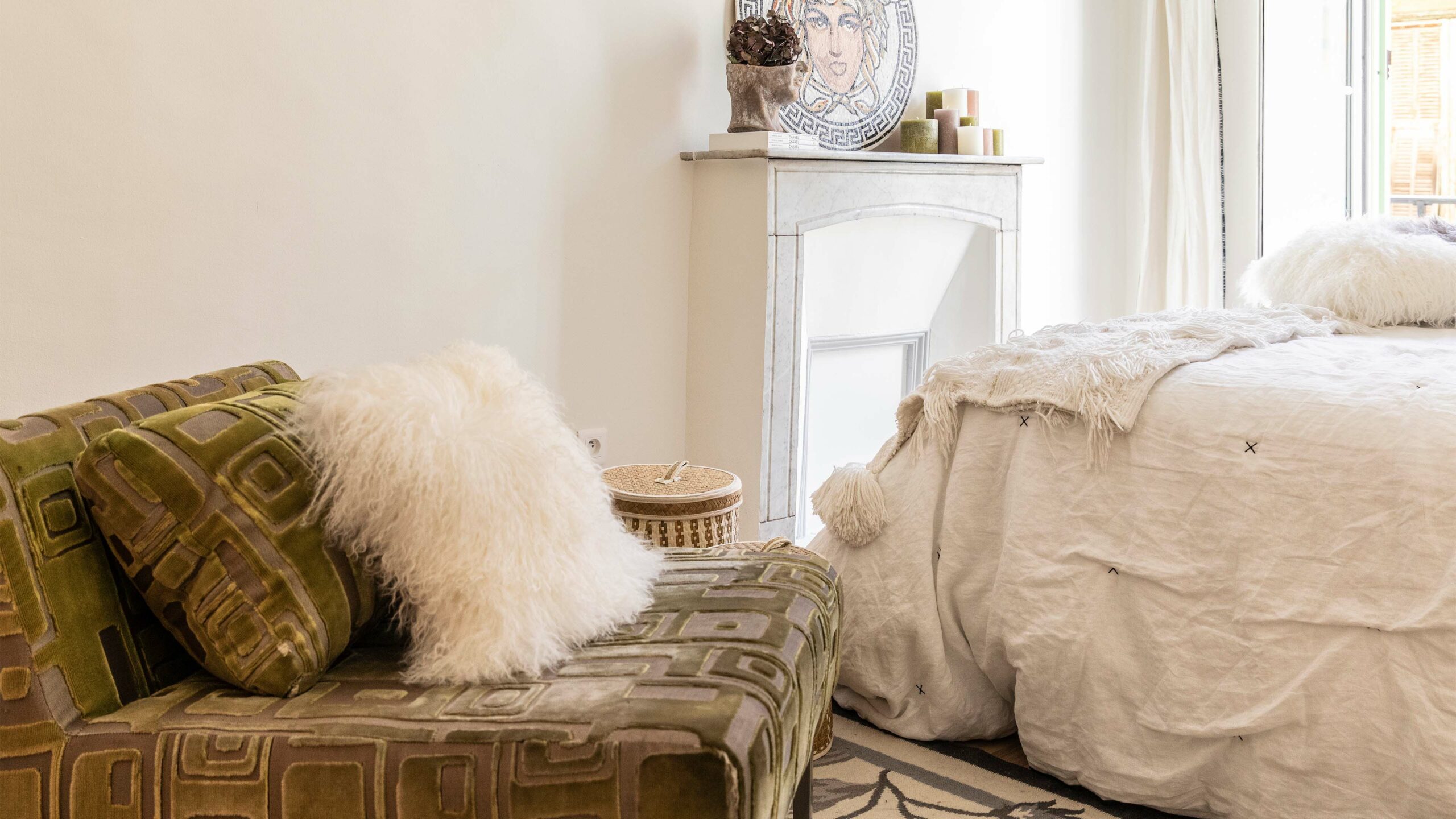 ‘We wonen tijdelijk in dit appartement. Ik kan op dit moment niet terug naar Kopenhagen en ik blijf niet in Nice, omdat ik rusteloos word. Maar dat betekent niet dat ik een half afgewerkte inrichting wil. Dus besloot ik om het een ziel te geven, om er een plek van te maken om in te wonen. Ik ben gevoelig voor mixen en matchen, dus natuurlijk mix ik ook materialen, texturen en stijlen in mijn inrichting. Een zeer persoonlijke setting met hedendaagse meubels met wat art deco-inspiratie die ik al lang had en nieuwe stukken die de toon zetten. Mijn stijl is zeer heterogeen, het idee is dat “alles goed bij elkaar past”.’